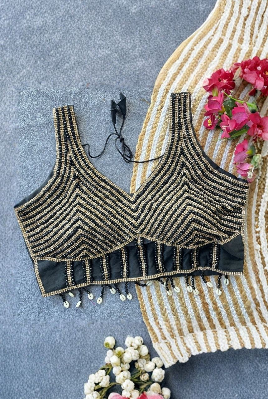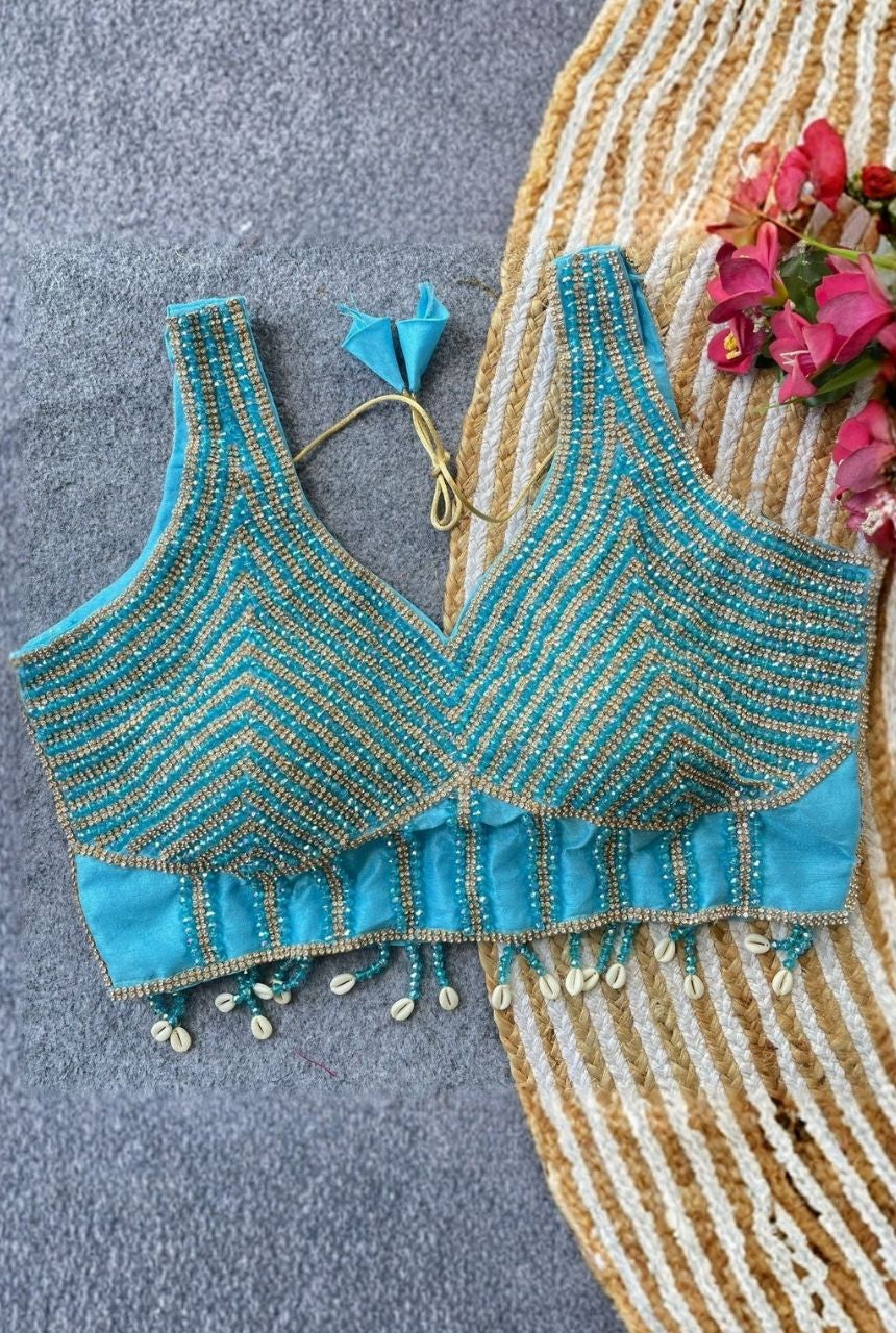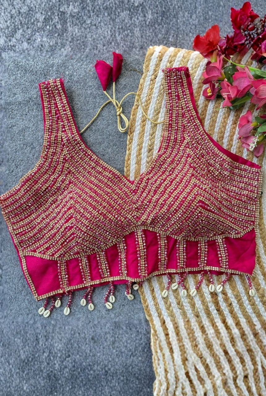 Stunning handcrafted pearls, moti and crystals make this blouse look elegant and festive.