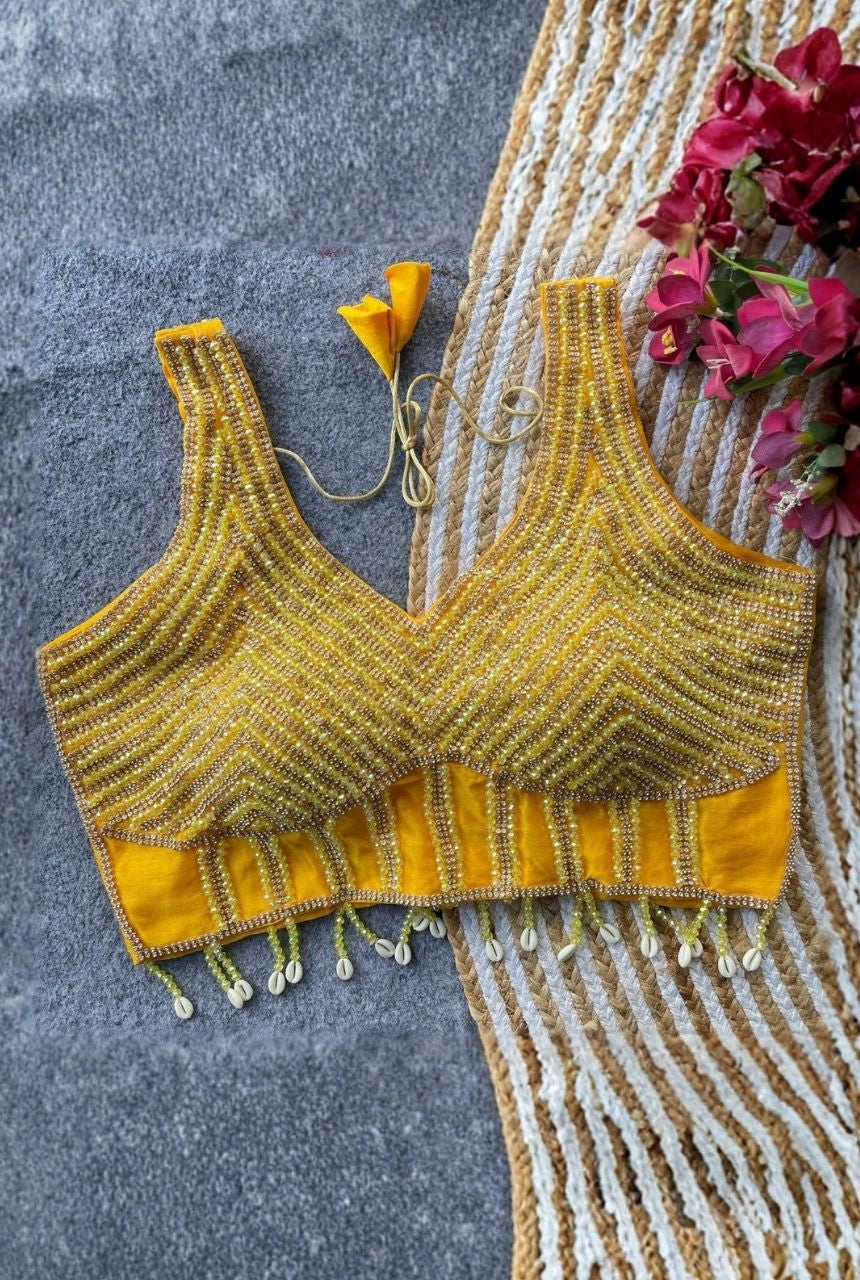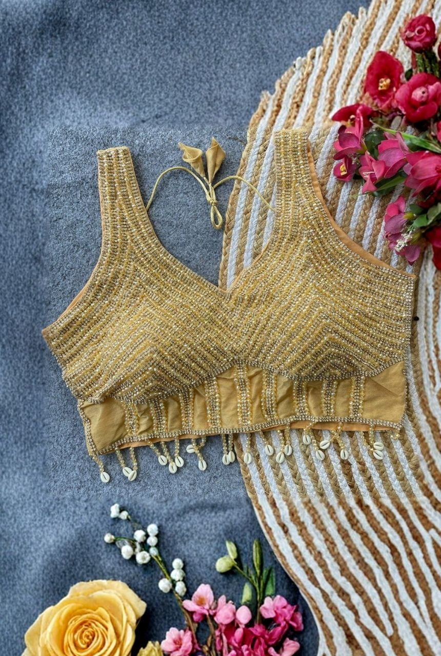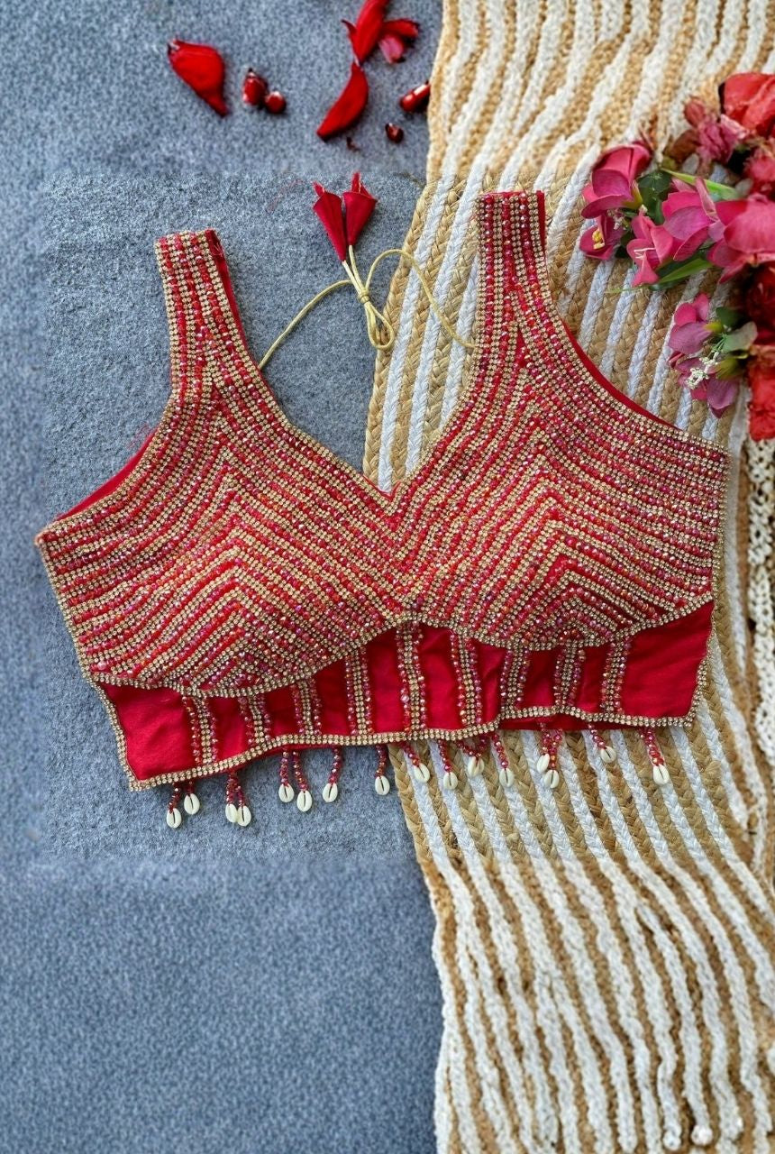 Stunning handcrafted pearls, moti and crystals make this blouse look elegant and festive.